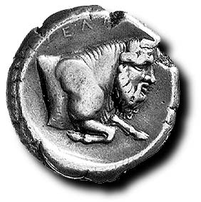 Manshövdad tjur på en tetradrachm från staden Gela på Sicilien, ca 450-430 f.Kr.