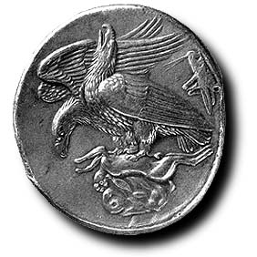 Djurstilleben av konstnären Silanos på en dekadrachm från Akragas på Sicilien, 412 f.Kr.