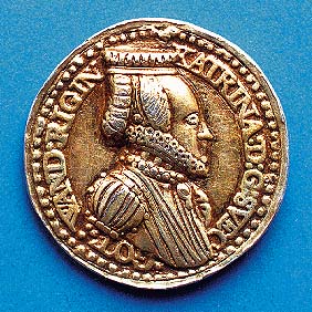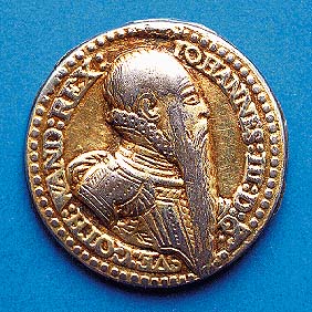 Samma medalj som föregående, men av brännförgyllt silver. Gjuten i två hälfter som sammanfogats och sedan ciselerats - speciellt tydligt på Johans harnesk och Katarinas dräkt. Detta (privatägda) exemplar är förmodligen "ett guldsmedsarbete" och har sannolikt varit försett med kantrand och ögla. Det är också mycket möjligt att dylika "gyllene" medaljer delades ut vid kungaparets kröning i Uppsala domkyrka den 10 juli 1569. Vikt: 13,84 gram. |