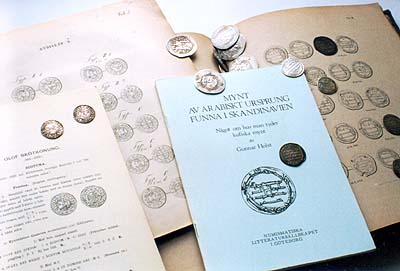 Mynten på bilden är dels Sveriges första mynt - Olof Skötkonungs silverpenning från anno 995 (t.v.) och dels arabiska silvermynt (t.h.) av den typ som förekommer i skattfynd - och naturligtvis också i hundratals myntsamlingar.